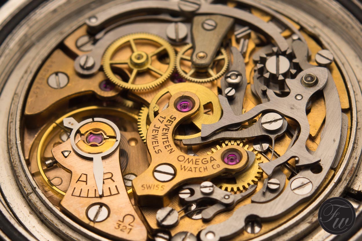The Cal. 3133 is a 23 jewel, cam controlled chronograph. It has a running second at 9 O’clock and a “30” min counter at 3. It has a sweep second counter and a quickset date mechanism.